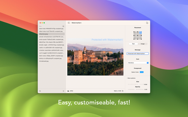 Watermarker + 就在这里,为图像添加水印从未如此简单!只需将图像放入 Watermarker+ 中,放入水印文本或图像即可,Watermarker + 将为您处理剩下的事情!