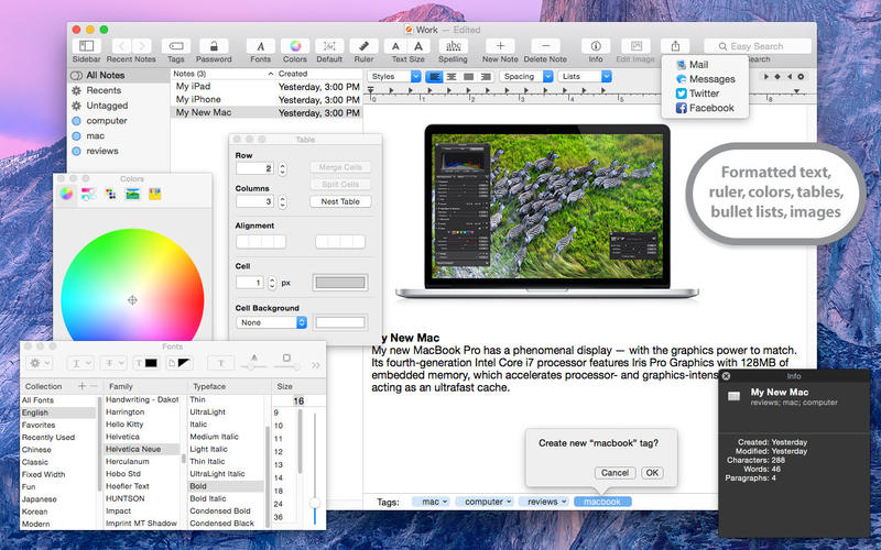 iNotepad旨在支持所有最新的Apple文本技术,可提高您的工作效率。根据需要编写文本并对其进行格式化,使用图像增强它们并将其导出为各种标准文件格式。双击一个图像即可在现场进行编辑。双击列表以在单独的窗口中编辑各种文本,同时继续在主窗口中查找所有其他文本。借助方便的搜索工具,标签和方便的导航最近系统,您可以在需要时快速查找所有文本和注释。