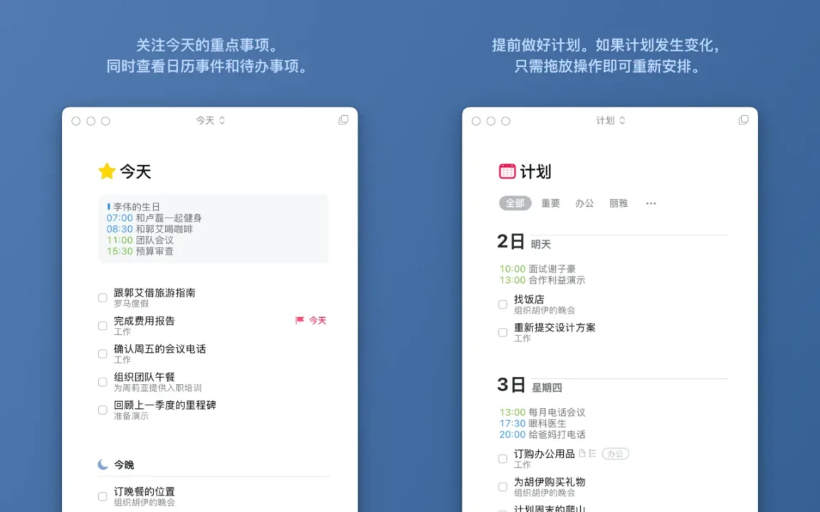 您的日程安排的所有内容都整齐地排列在“今天”和“计划”列表中,显示待办事项和日历事件。每天早上,查看今天计划并决定想做什么。