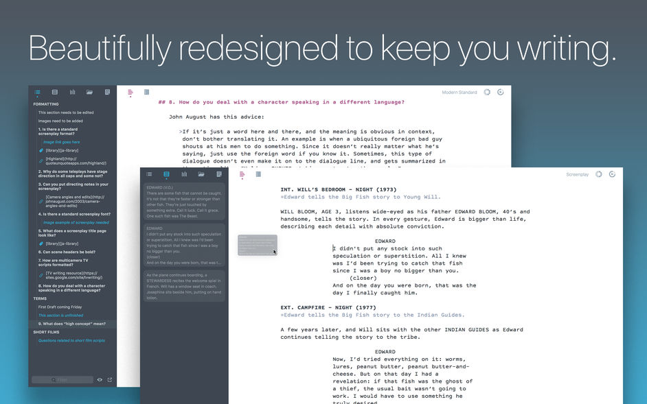 我们已经采用了我们为编写剧本创建的工具,并使它们适用于您编写的几乎所有类型的文档。从小说到博客文章和学校报告,Highland的清洁设计和创新工具可帮助您专注于单词,而不是格式化。