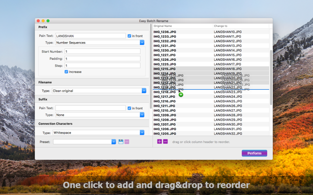 你不必小心犯错,通过即时预览,你可以直观地看到修改后的文件名。你还可以通过拖放或自动排序功能调整文件的顺序。