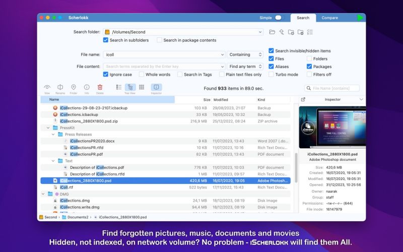 因为 Scherlokk 不依赖于 Spotlight 的索引,并且拥有自己的强大搜索引擎,它能够找到计算机上任何可访问卷中的每一个文件。