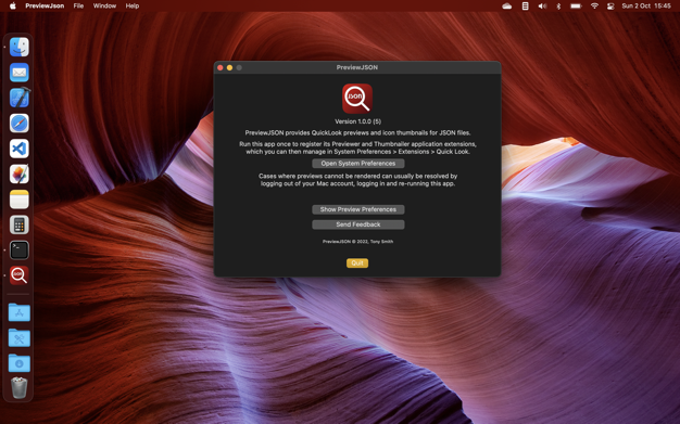该应用提供了两个应用扩展:JSON Previewer 和 JSON Thumbnailer,可以在 macOS 的 System Preferences > Extensions 中查看和管理。 应用程序本身就是这些扩展的容器,用于设置您的偏好。